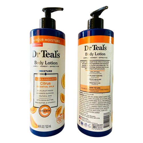 Dr Teal’s Moisture + Radiant Vitamin-C Citrus Essential Oil Body Lotion is the simple, honest & effective body lotion which is formulated with moisturizing ingredients plus beneficial essential oils to nourish and renew skin. It enhances the radiance of the skin. Vitamin C helps to promote glowing, youthful skin, while citrus essential oils helps to uplift your mood. Shea butter & cocoa butter have skin softening & moisturizing properties. Vitamin E has a skin protective function. This light-weight formula is dermatologically tested.